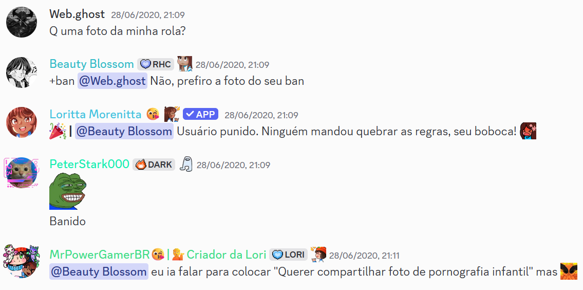 A primeira mensagem eu estava comentando sobre o ban de uma pessoa, que o cara tinha falado "Vou enviar foto da rola" e eu comentei que o motivo dela deveria ser "Querer compartilhar foto de pornografia infantil", tanto que a "Beauty Blossom" (DanielaGC_) era da equipe da Loritta, por isso que eu estava comentando com ela.