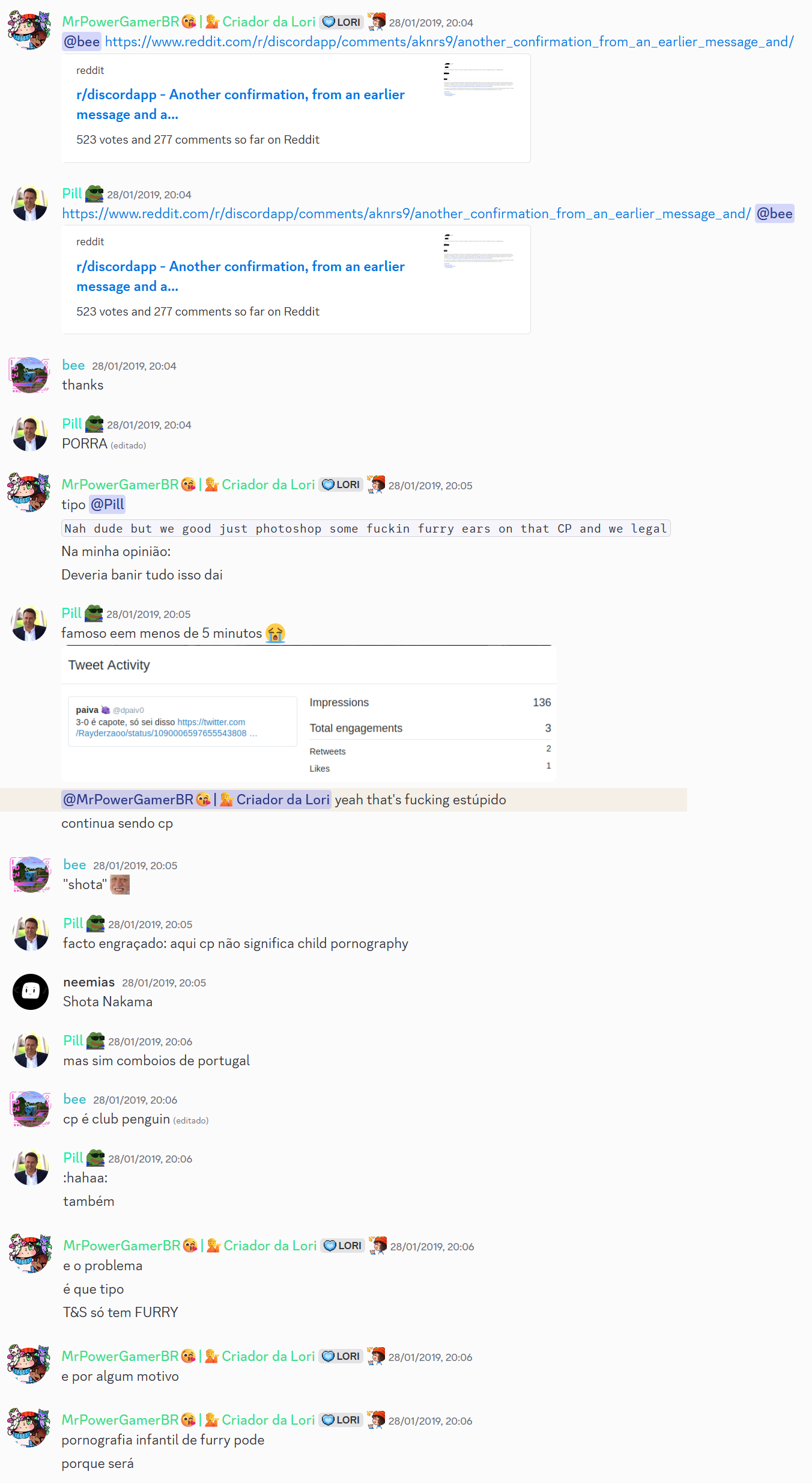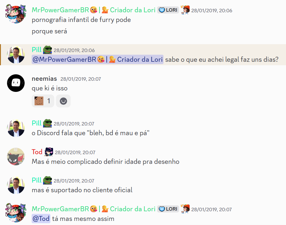 As duas últimas mensagens (não, eu não enviei errado e nem você viu errado, o Discord me puniu duas vezes pela mesma mensagem) são relacionadas com um fato que aconteceu em 2019, que o Discord deixava enviar pornografia infantil de furry (cub) no Discord. Eu estava comentando na época que isso era uma regra extremamente tosca já que, se lolicon/shotacon é proibido no Discord, nada mais justo que cub porn também ser. Isso dai era em 2019, e essa regra foi alterada a muito tempo atrás. Como isso era um assunto quente na época, estavamos discutindo sobre isso no chat. Uma pessoa falou que o Discord não permitia clients modificados e isso era meio paia, e aí eu respondi com "mas pornografia infantil de furry pode", brincando e zoando o fato que modificar o client é proibido, mas que compartilhar esse tipo de conteúdo é (era) permitido.