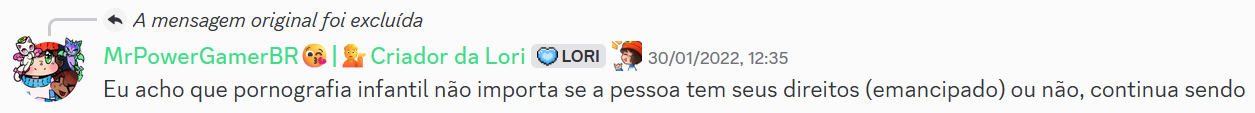 Mensagem que foi denunciada: Eu acho que pornografia infantil não importa se a pessoa tem seus direitos (emancipado) ou não, continua sendo